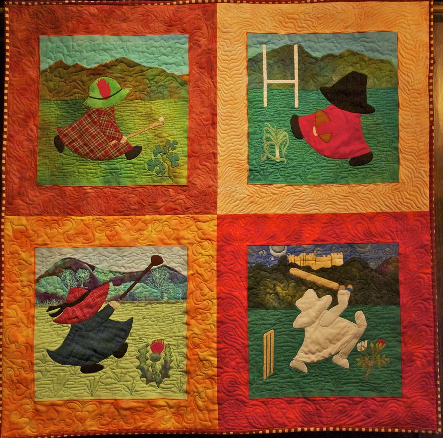 | Design Source - Description | Started in Show and Tell. Sue is playing: Ulster camogie, Wales rugby, Scotland hammer throwing and England Cricket. The hardest part was finding an emblem acceptable to both Ulster communities. |