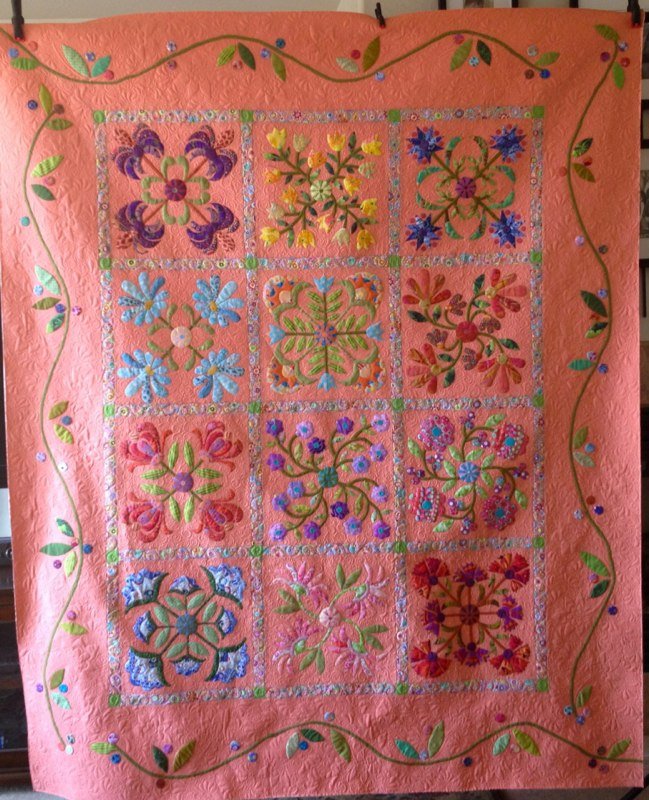 quiltsncatz Kaffe and Millie's Garden - This was a BOM offered by a local quilt shop (thank you instructor Joan Carrell). It actually took 2 1/2 years to complete but I am very pleased with my new machine applique skills and the resulting quilt. Background fabric is Kona and applique mostly Westminister Fabrics, primarily Kaffe Fassett.