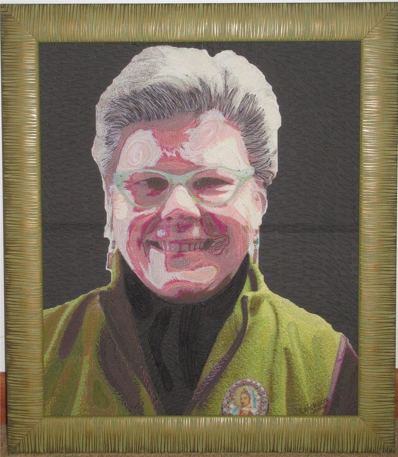 Bertwood "My Friend Anna" - My friend Anna died of cancer this year. She was a good friend and a talented quilter. I had taken this picture of her several years ago, so I decided to make a fabric portrait from it. I pixelated the photo.....printed it out on fabric numerous times....cut it all apart and layered it back together by colors and shades. Then I thread painted it all, matching the threads to the shades. Some parts of the portrait are four layers deep.