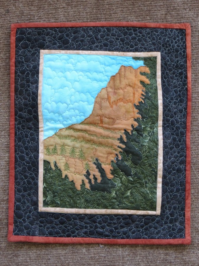 calley Grinnell Point at SUnrise - Based on a photograph taken one morning at the Ranger Station in Glacier. Fabrics are hand-dyes and commercial prints, free motion quilting. Small wall-hanging.