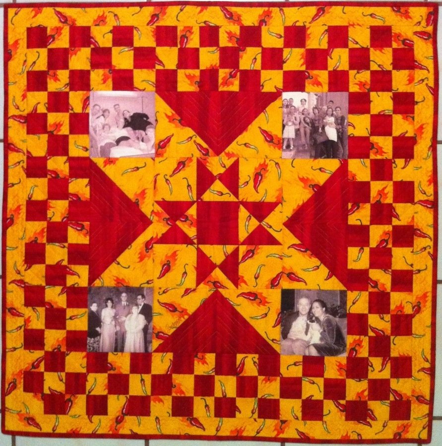 Limbania55 My First Quilt - I found Alex Anderson show at HGTV and loved watching it. At some point I decided to learn to quilt and after getting some books at the local library, considered it would be better to take a class at a LQS. This quilt was started in the first quilting class I took when we lived in Anchorage, AK. I decided to substitute some patches for photos that I printed in fabric. Formatted the photos with a sepia finish. It hungs in my kitchen. Can you tell I love hot and spicy food?