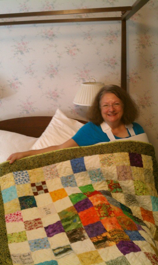 mlmurphy1012 A hug for my sister - My sister had broken her arm, and I raided her Facebook friends requesting they send get well wishes. I pieced top, Bonnie Spoon added border and back and did machine quilting in an all over pattern of sewing tools.