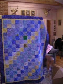 mlmurphy1012 Eliza's Hug - Adapted to large twin size. Jane cut assorted batiks and send secretly to family and friends, who returned with get well wishes. Adapted to suit returned squares and include blank squares for additional signatures. Margaret arranged and pieced squares; Bonnie quilted in all over butterfly pattern. Jane finished binding.