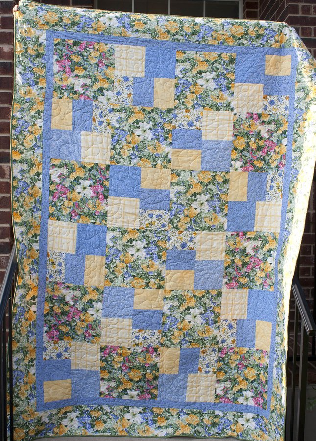 Kellym Twin One of "Twins Separated at Birth" - This summer we had an exchange student with us for 7 weeks. She wanted to make a quilt for her sister who is a bit "goth." Lucia picked the fabrics, I taught her how to cut and sew it and she did (well most of it). Meanwhile, I made this quilt for a friend's daughter graduating from high school, with the same pattern, but very different fabric. It is so fun to see the difference between Twin One and Twin Two. They both have the same quilting pattern.