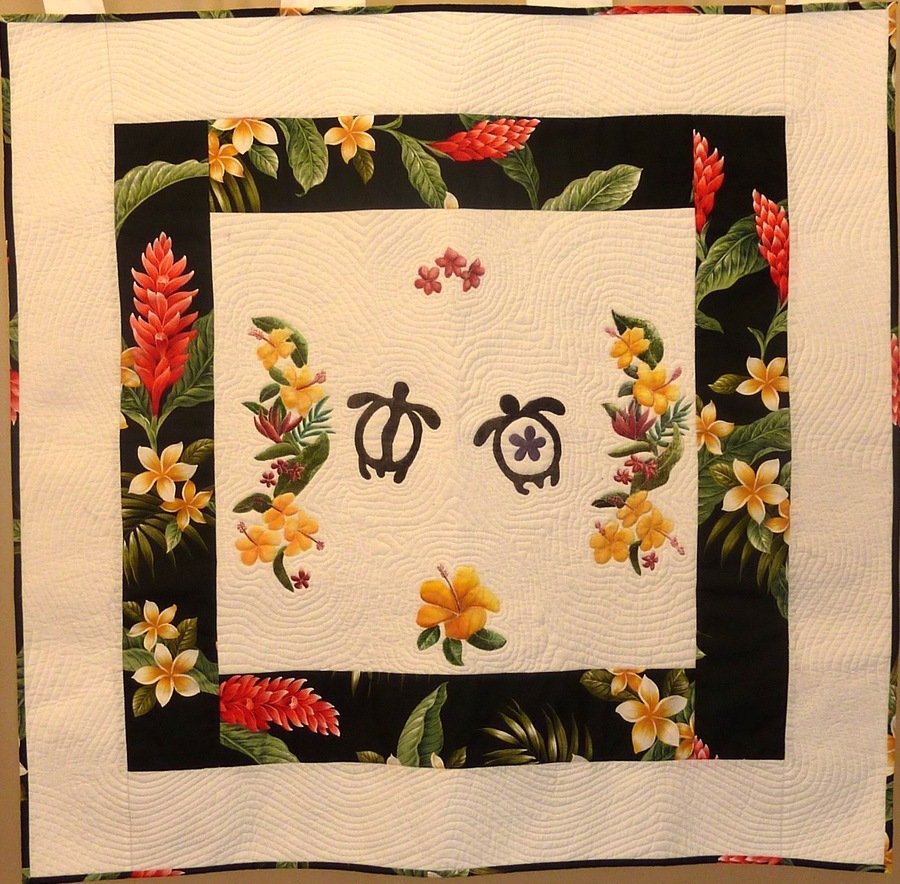 rutterla Tracy's Wedding Quilt - I hand painted the center panel based on the design from the groom's (who is half Hawaiian) wedding shirt. My sister-in-law and her husband love the sea turtles, so I also incorporated two of them into the design, to represent the two of them. The quilting is in the traditional Hawaiian style.
