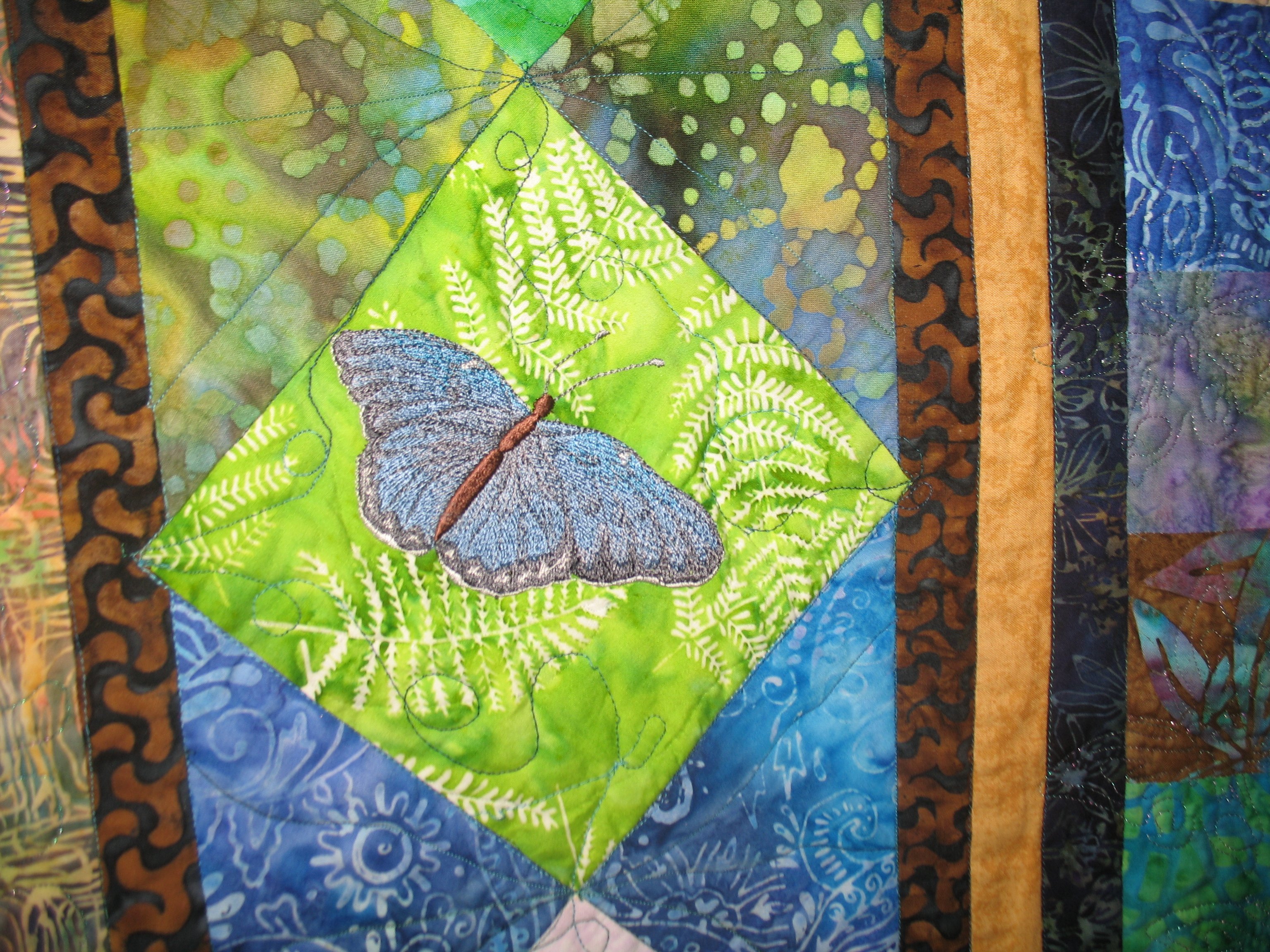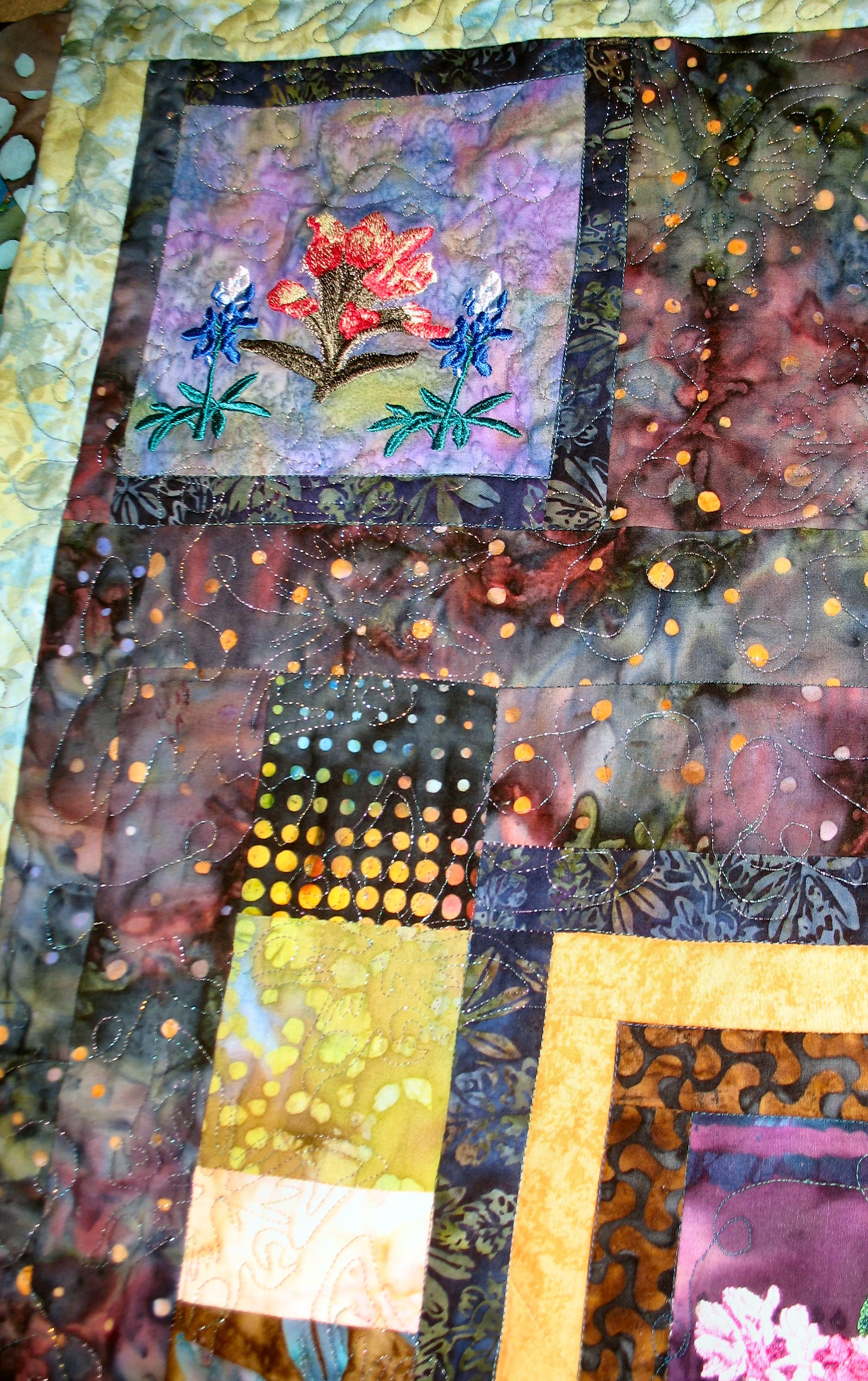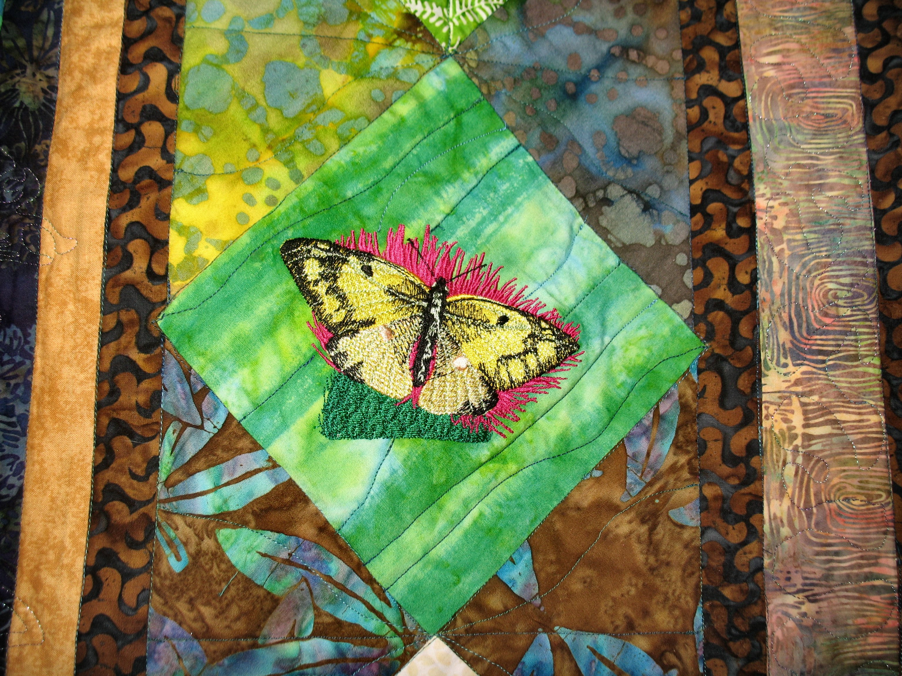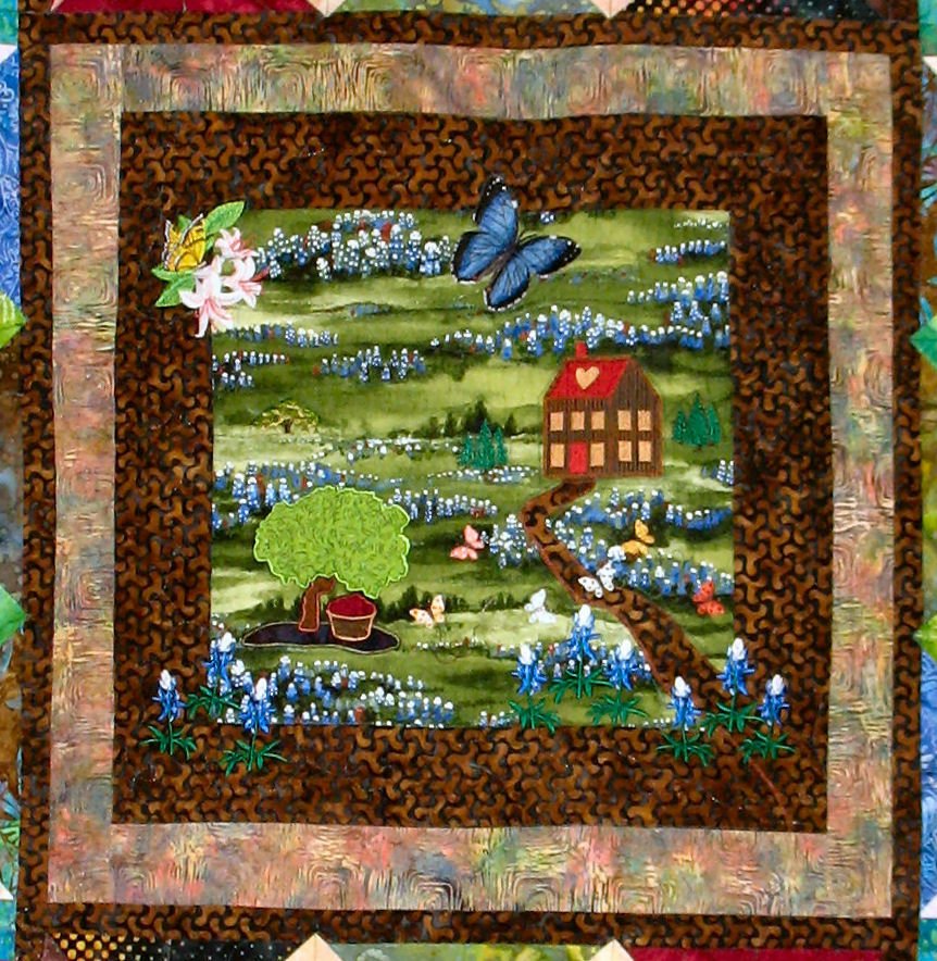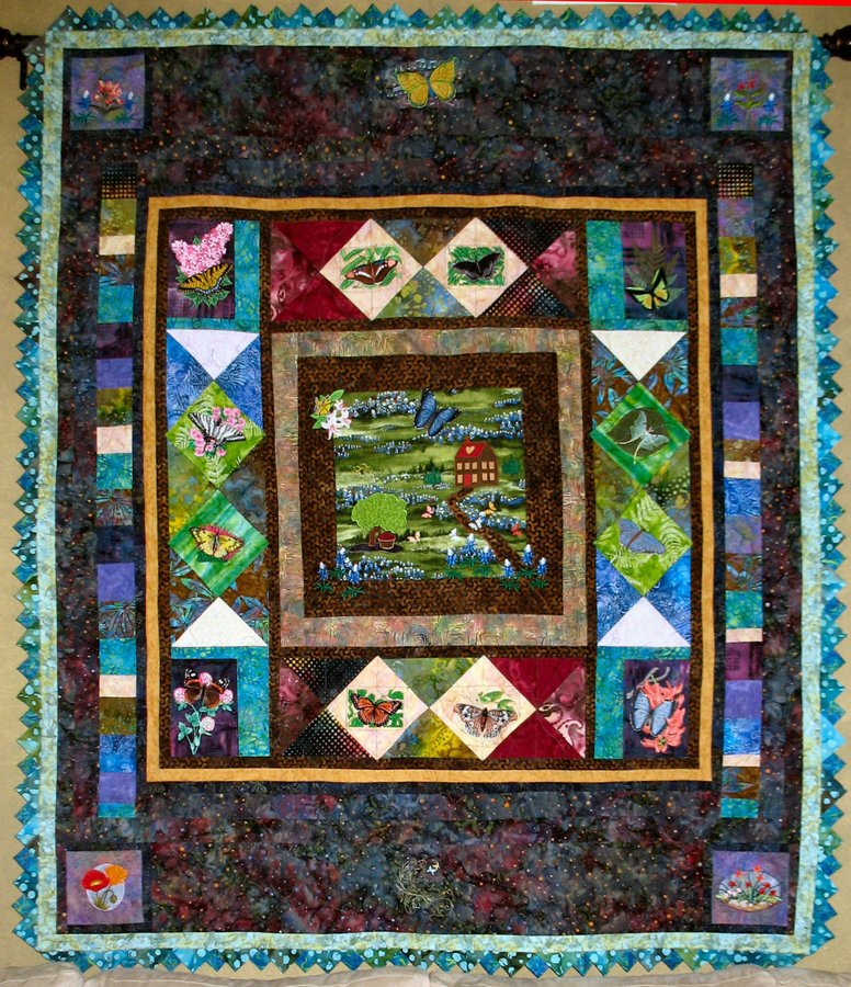 "My Butterfly Flutterby", was the 4th quilt I ever made. I really enjoy machine embroidery and wanted to see how they would look on batiks. - Using placement ideas from McKenna Ryan's "Bela Garden" quilt, I chose embroidered butterflies as the theme of this quilt centered around a butterfly view of a Texas scene of wild flowers. The center fabric is embellished with embroidered wild flowers, appliquéd house, and embroidered trees. It features a 3-D embroidered butterfly. Machine embroidery patterns are by Embroidery Library and Singer. A double row of prairie points features 2 fabrics.