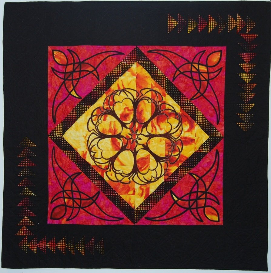 nsturgill Earths beginning - The polka dotted triangles "float" . They are open on the long side around the center. The triangles on the outside are prairie points. The center is inspired by the Celtic story that when the first rays of sun touched the earth the dryads were created to make the world habitable.