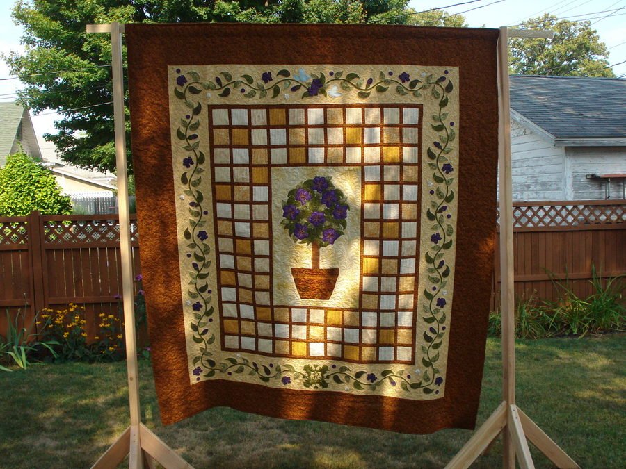JaneAnne The Wedding Quilt - This quilt was made to hang as a backdrop at the outdoor wedding of our daughter Mary Jo and to be their wedding quilt. Her colors were purple, green and ivory so the center topiary was created to depict the nature theme using purple flowers. In the first border, I created a frame from three inch squares that are pintucked various neutral nature themed fabrics. The second border includes more of the purple flowers and leaves and white pear blossoms made from leftover fabric from my wedding gown.