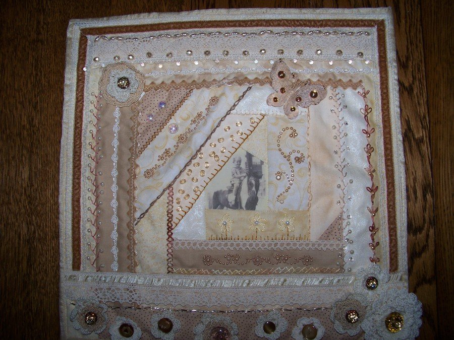ann6340 Aunt Shirley - Hand embroidered and hand beaded. Picture of my Aunt Shirley about 1937. Five brown buttons on bottom from my mom's button stash I received after she passed. The five buttons represent her five family members. The three daises represent the three girls growing up. The three separated buttons on upper left represent the three girls (two still living and the other passed).