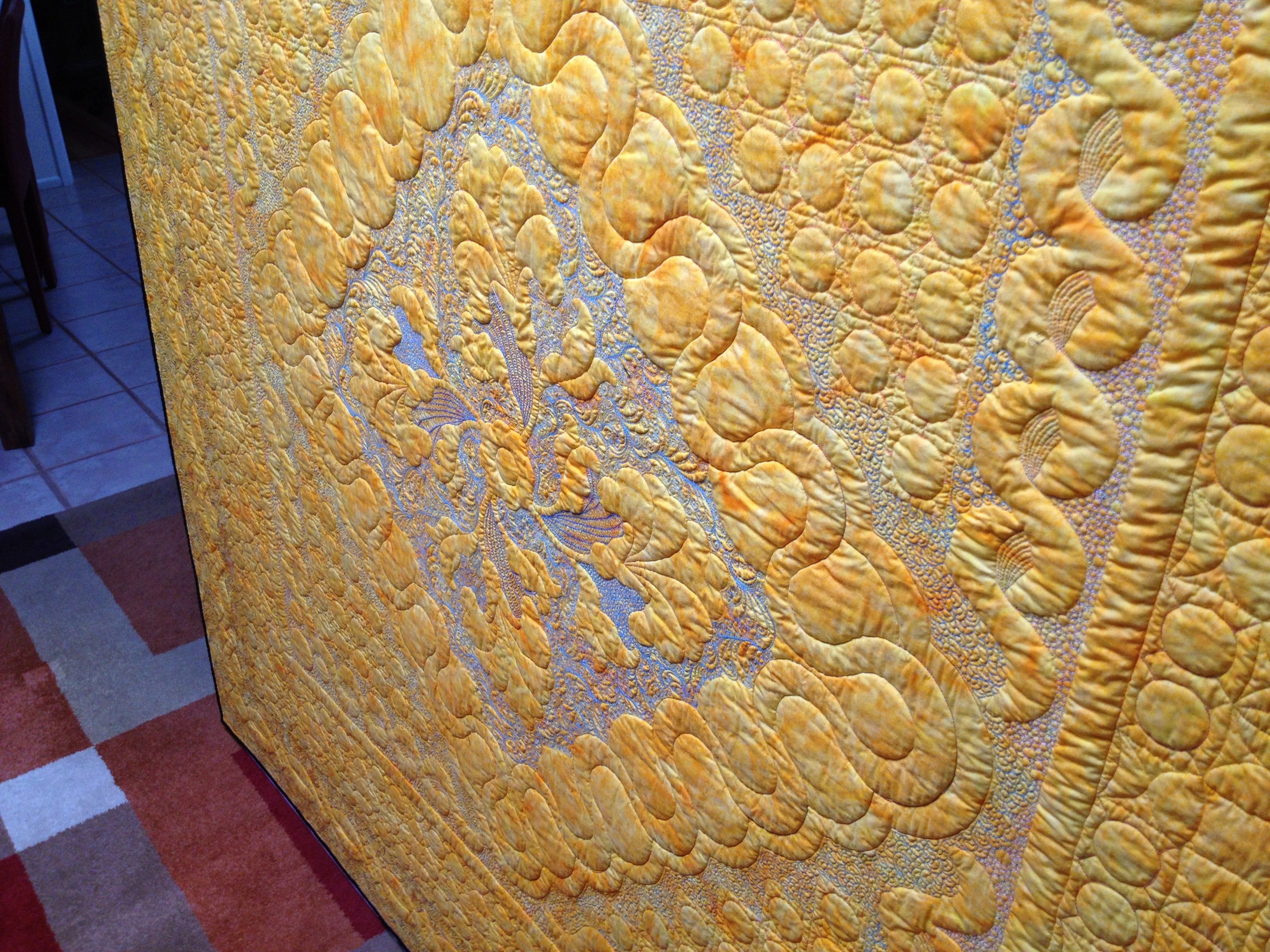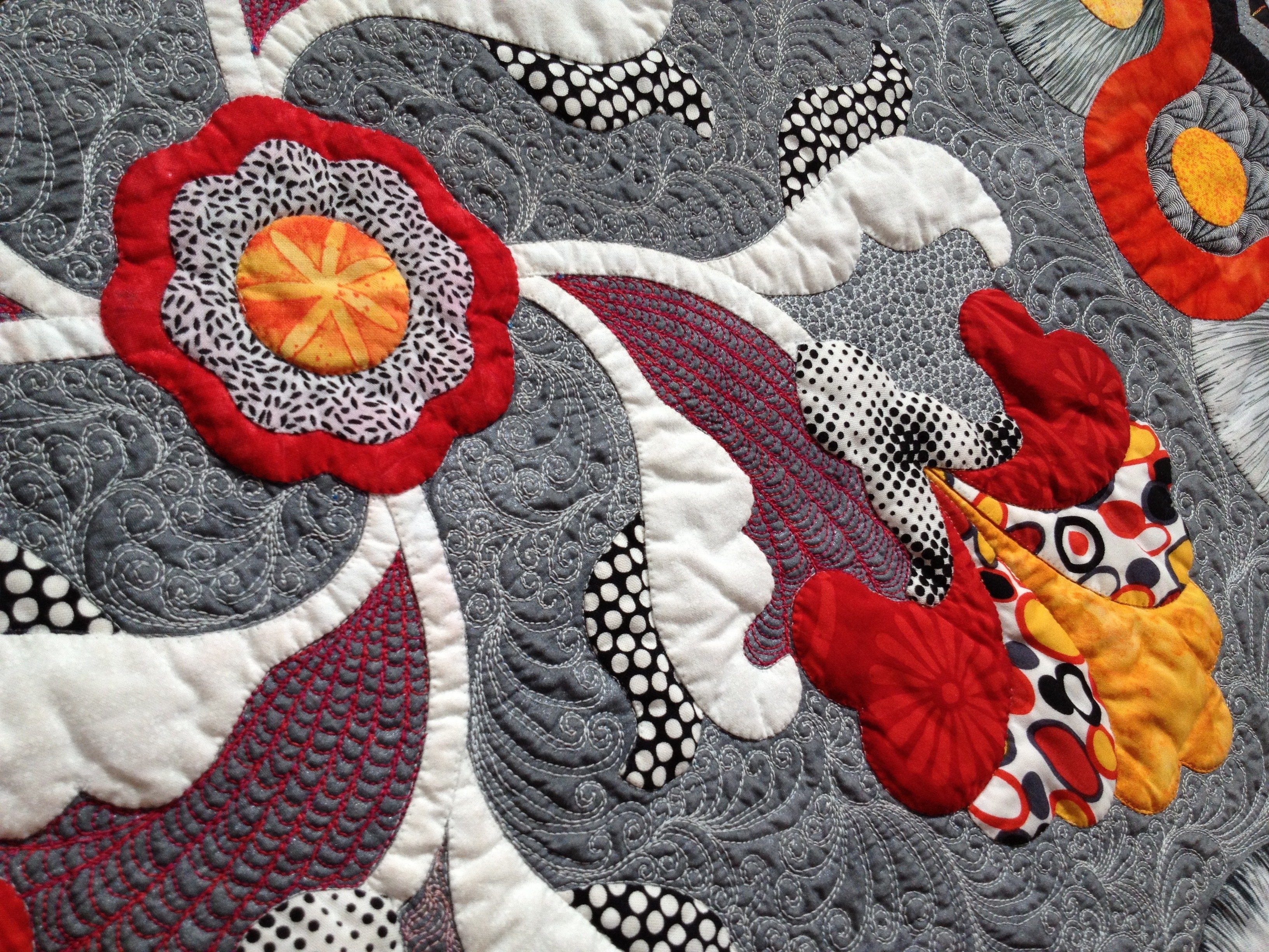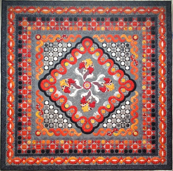Tilde - Part of a primarily one-color series using punctuation marks, Tilde started with a purchased appliqué pattern and was completed medallion-style with original borders, some using traditional blocks. Tilde was amazingly quilted by Teri Lucas.