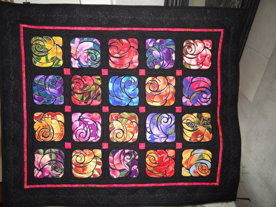 Marnie My Dream Garden - From a kit by www.detailsbydiane.com. The flower fabric is machine appliquéd onto a black background. The center was quilted on a long arm and the border on a home machine.
