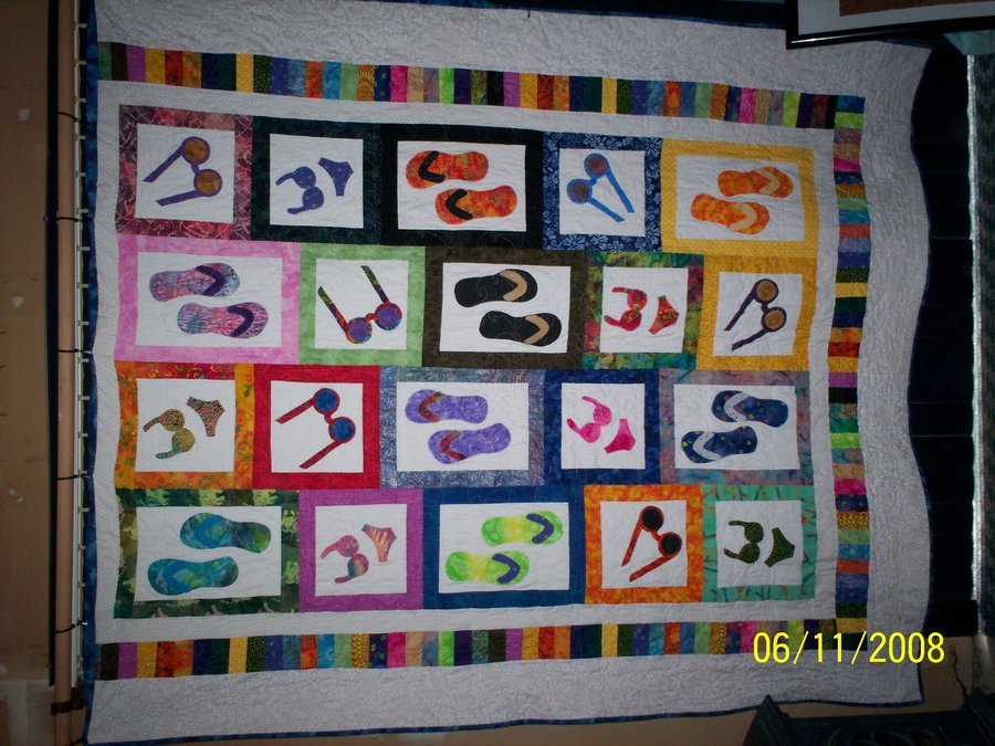 sbflesher The Beach Quilt - Added appliques of my own design after seeing a flip flop quilt pattern. Made for fundraiser for a local hospital to raffle.