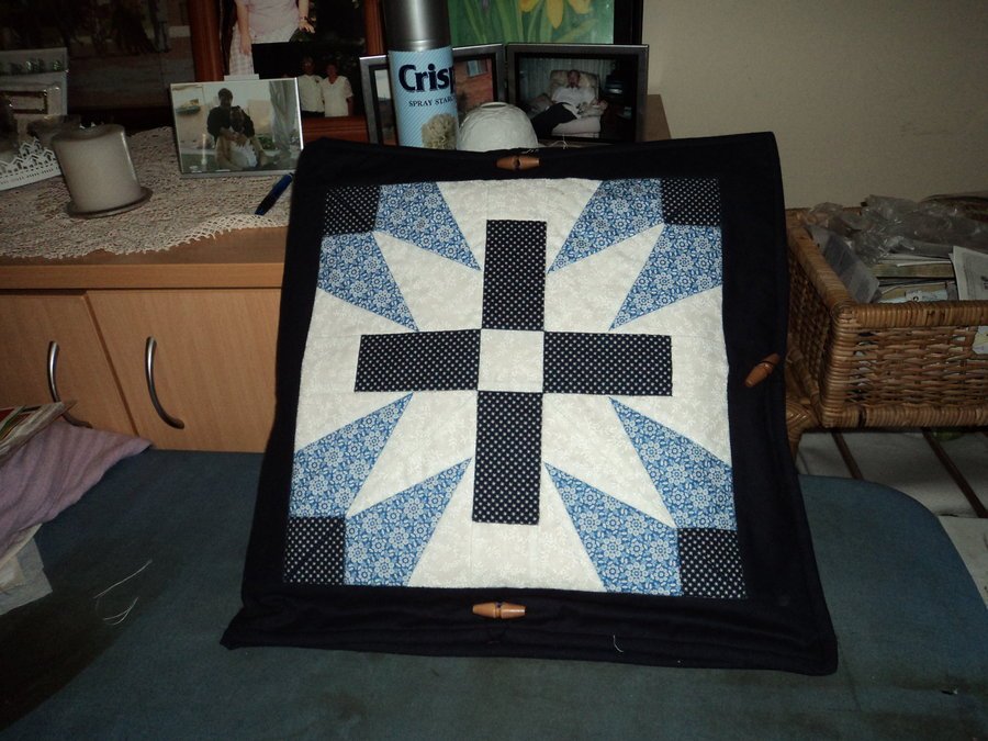 sarah21 UFO Blocks Carrier - Two16 inch blocks with designs were choosen (Schoenrock Cross Front & Chained 5 Patch Back) were made. Then a outer border measuring 2.5 inches was attached to make a single panel showing the two designs. Then a sandwich was made and both blocks were stitched in the ditch using 50 weight thread Rasant. The inside of the carrier was then formed and the two blocks were separated to front and back. A cardboard insert was inserted into the back section and covered by a bright pink fabric. Then a 2.5 inch binding was attached. Toggle buttons were sewn onto the front so that blocks could be easily accessed and closed in.