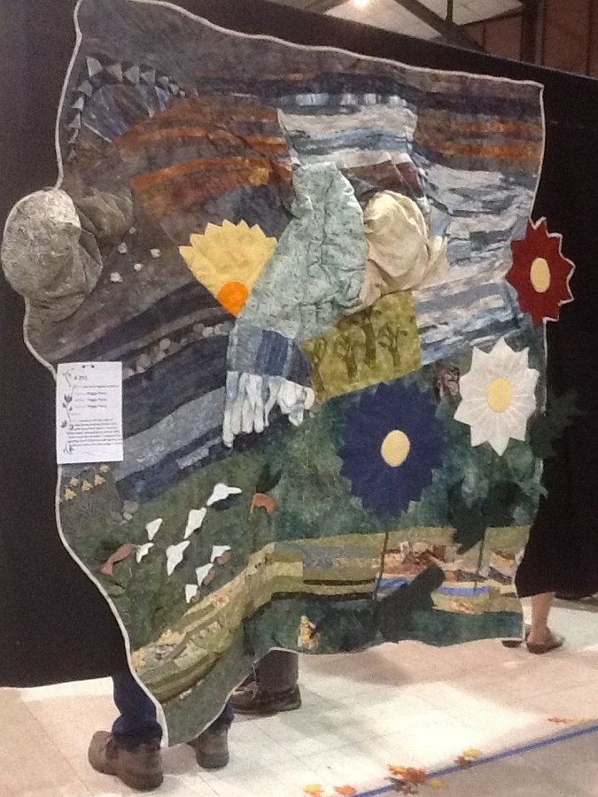 PeggyPerry Day filled with apliqued peace - I was making a Dresden plate quilt a coworker sujested they would make cool flowers. So I started makeing a landscape quilt with Dresden plate flowers. It was very peaceful makeing this very organic quilt, it grew and formed a landscape as natural as a true landscape. Nothing is perfect but neither is natur but it is ver peaceful.