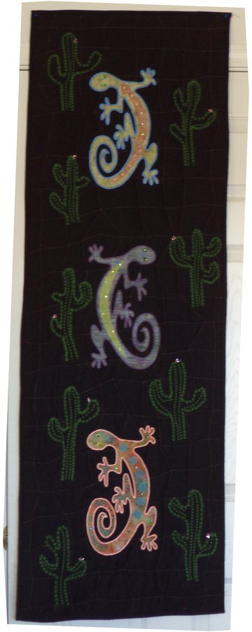 cyncrull My Fancy Lizards - After a class with Karen at our Thumb Butte Quilters, I manipulated the lizard on my computer and then digitized it for machine applique. The cactus are done with a fancy stitch from the sewing machine. Other embroidery by machine