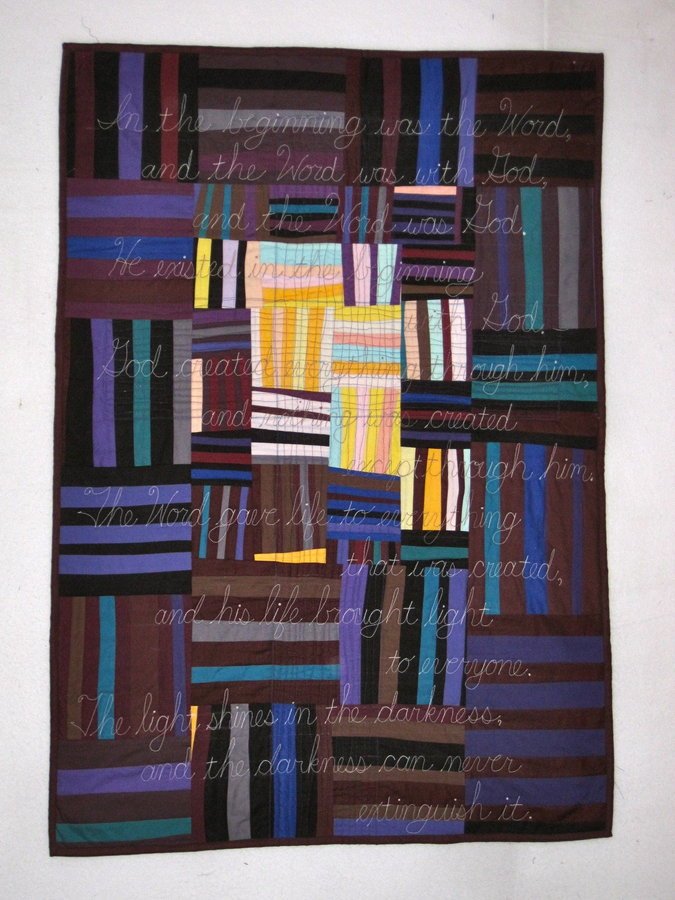 DebbyWeighsIn John 1 - Another of the 'Housetop Quilts.' The beautiful poetic words about Jesus found in John 1 are machine quilted on this quilt.