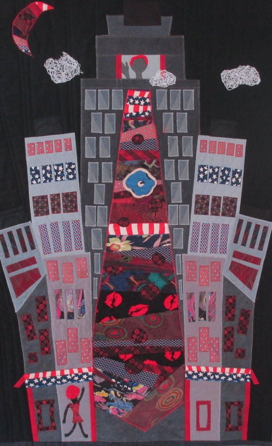 Cuauhtemoc Up There (My Daddy Works Up There) - Applique on fabric; quilted by machine. Used a stash of old silk ties.