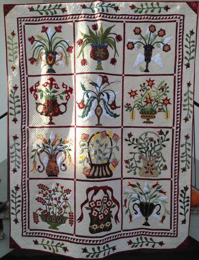 KonoJean Bouquets for a New Day - I started this quilt in 2008 when Sue Garman's pattern and instructions were first posted. I followed month by month faithfully. But good hand applique takes time. Work schedules, illnesses, then a move across the ocean when all my things were in storage for months got in the way. Once the blocks were finished, I sewed on the plain cream border suggest but was not satisfied. I just had to do more hand applique to complicate things. Then how to quilt it? The center was mostly done struggling with a domestic Bernina. Half way through I decided to buy an Innova long arm quilter. Now, four years later, I can finally say I am finished and satisfied. Four years was well worth it!
