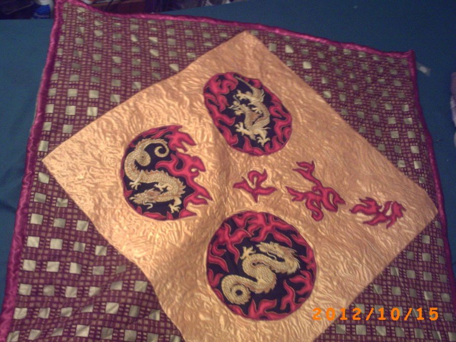 | Design Source - Description | Satin backgoud with trapuntp applique dragons. |