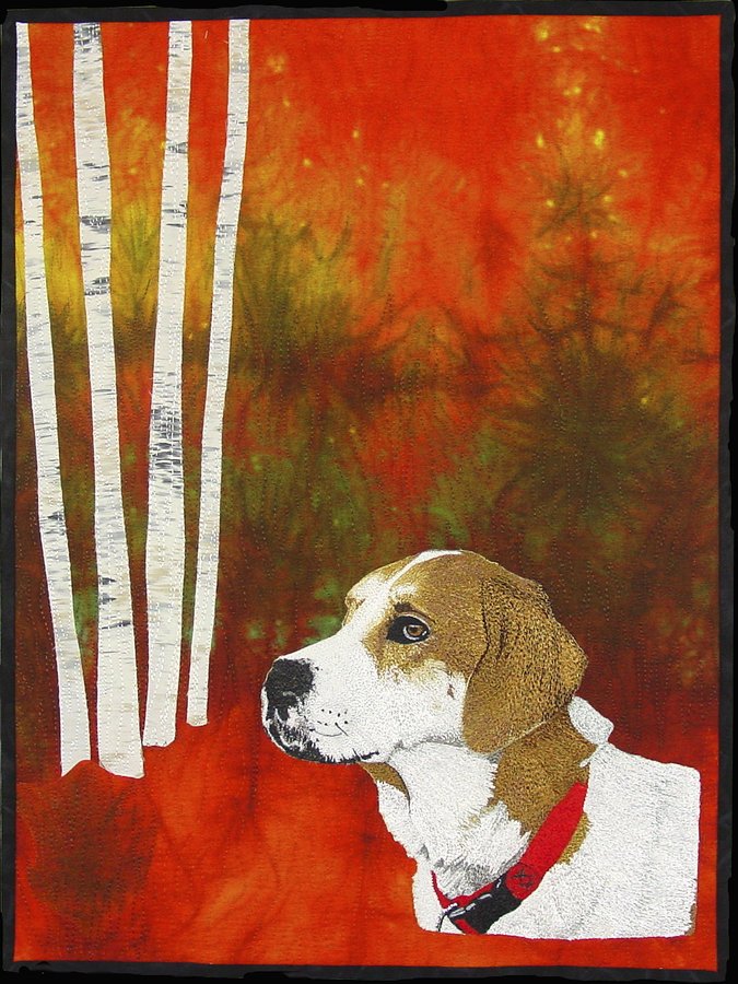| Design Source - Description | Boomer was made from a picture by Tim Hale of Flutterbye Images and used with permission. Boomer is thread painted free hand the trees were fusible applique and it was free motion machine quilted on a Bernina 440QE. |
