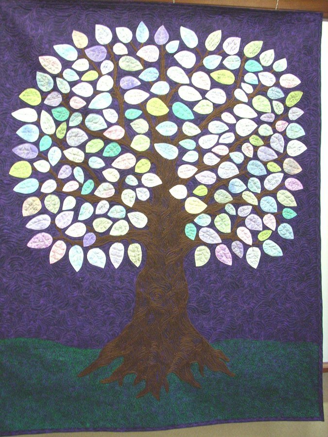 QuiltingYvonne A Quilt for Mollie - I created this unique signature quilt for Mollie, a 25 year old coworker who suffered a brainstem stroke in early 2012 and is paralyzed from the nose down. The tree trunk is couched, and the rest of the quilt is free motion quilted.