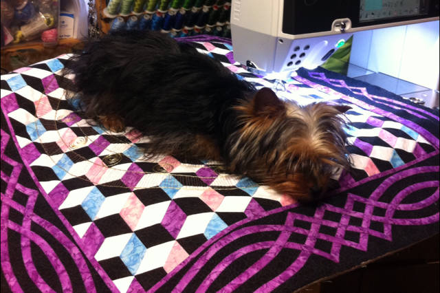 This is a wall quilt I´m practicing different teknikes on. My dog dont like that she was´nt on it so she put her self on it ,... or she thinks I´m petting my fabrics mor then her .... ;) |
