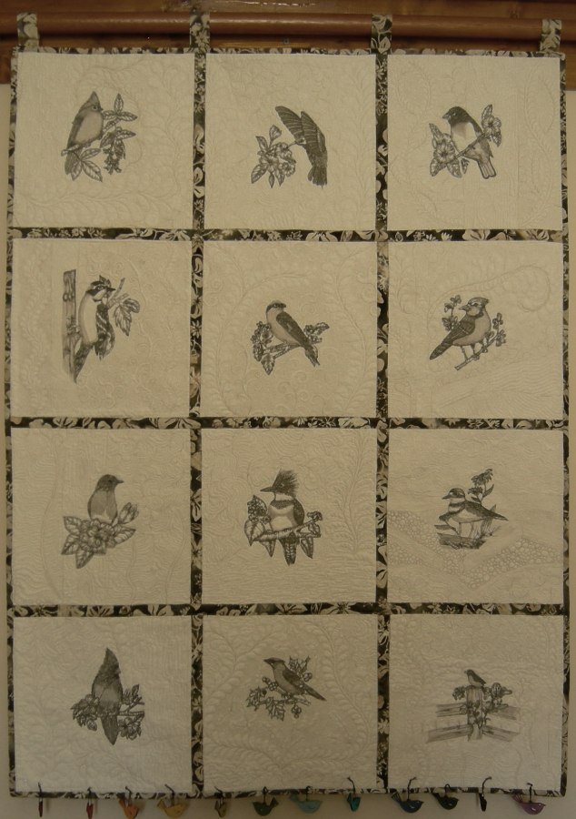 suehenyon Feathered Friends - Embroideries are from OESD's Feathered Beauties. I made this to practice FMQ, creating a scene for each bird.