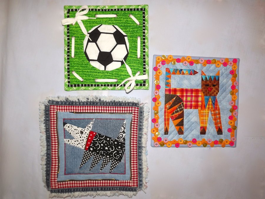 Ch3ryl mug rugs - Mug rug for niece no. 1 - hmm, second thoughts about using white fabric on a mug rug but maybe coffee stains will iust look like dirt from kicking the ball around? :_ block was a freebie on paper panache.com Mug rug for niece no.2 - I had great fun searching through my button collection for just the right buttons for the border. Cat block is from an old Quilters Newsletter magazine. Mug rug for one and only daughter - This is a block called Yappity Yap from an old QN magazine. Fun and quirky, just like my daughter.