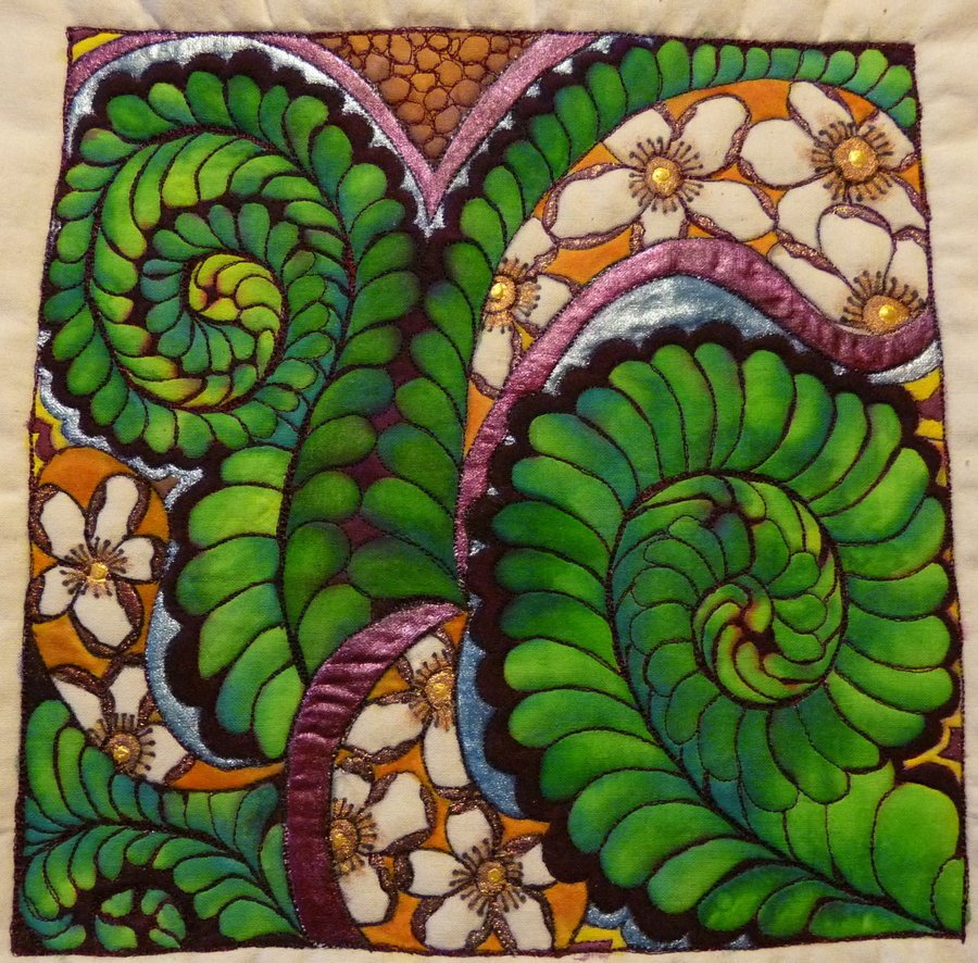 Loralye2 Feathered Fronds - This piece started out as a practice piece for stitching feathers. After years of trying to learn how to draw feathers, let alone stitch them, it finally fell into place. I had purchased Ricky Tims "Grand Finale" DVD and by watching and learning from many other great quilters, I finally learned how to do feathers, and now can stitch them without having to draw them out! Great FUN! I was also learning how to play with fabric paints, dyes and pencils. This piece was colored in after it was stitched using Inktense pencils and Dye-na-Flow and Lumiere paints.