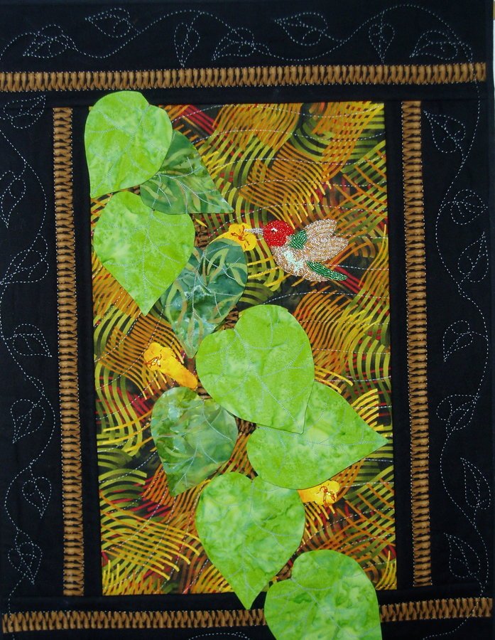 MLAbbey Hummingbird Jungle - A beaded Anna's hummingbird is attracted to yellow flowers with beaded centers on a vine with 3-D leaves.