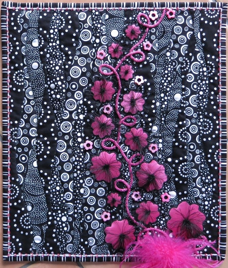 Robinn Foxy Lady - Flowers are made from satin gift ribbon, trapunto, and machine appligue . Center of flowers are gathered eyelash yarn. Feather hair adornment clip added the foxy touch that gave the quite its name.