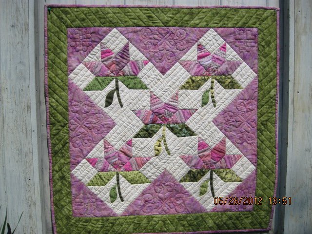 maillady010 Sister's Love - When my brother was informed that his life was ending he asked only that I come to visit, sit on the porch with him and quilt. I pieced the top on my machine, flew down to Atlanta and did just that. Three weeks later I was in a car traveling back to Atlanta for his funeral with my needle and thread to keep me sane during an insame period. The entire piece is hand quilted with much love and respect for a dear man who taken too early from my life.