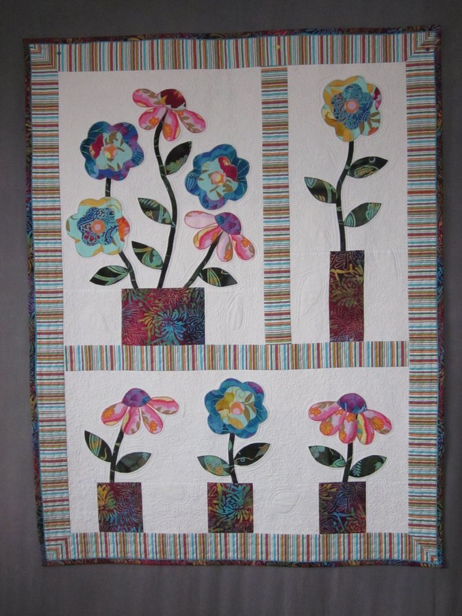 judith123 Flower pots - I needed to make a cot quilt very quickly for Holly, my soon to be born great-niece. This pattern in the Mc Calls magazine looked easy and quick to make. It was made in a week with machine quilting and with machine blanket stitch to secure the flowers.
