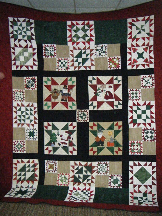 sewfortwo Santa's Christmas - The center blocks are Santa BOM (16") from Sister's Quilt Shop & the other big blocks are BOM from Greenbaum's uilted Forest and I adapted the little pieced blocks to fill in the spaces. This is the first King Size quilt I made and also the first time I used nylon thread for the quilting. I love the way this has turned out, but I am willing to part with it. It is the experience of making it and using different techniques that make it so I will never forget it.