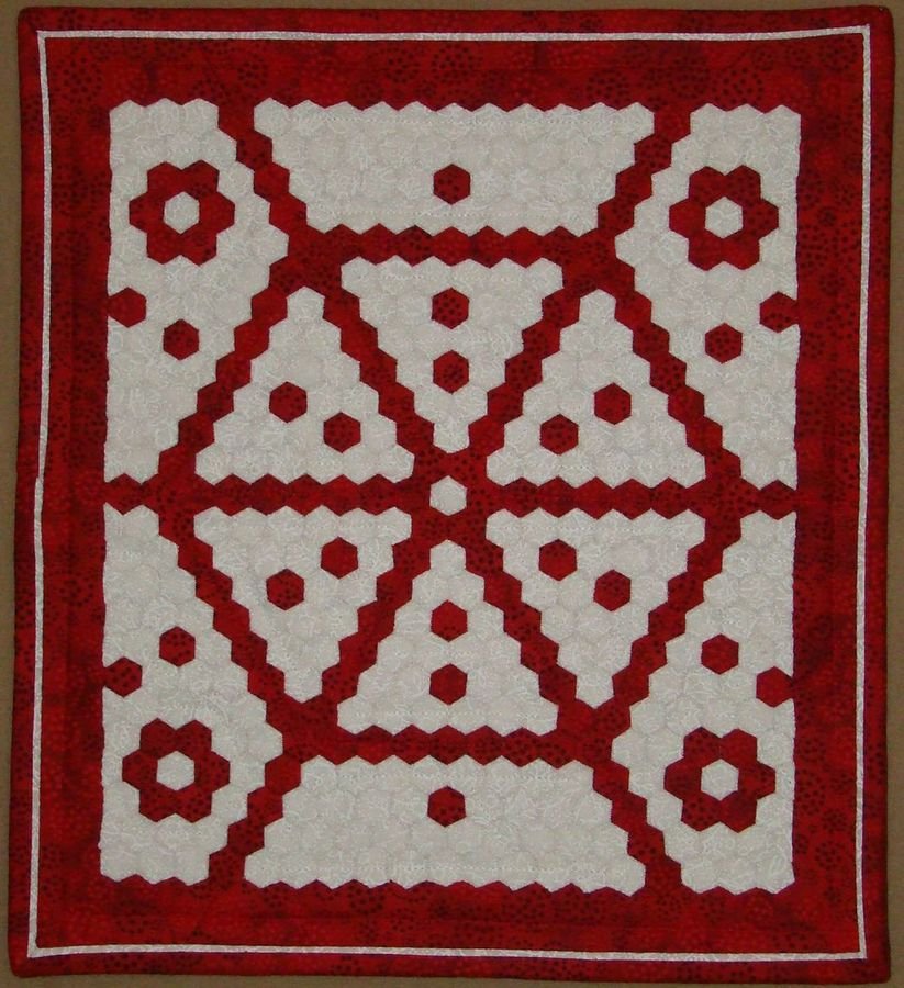 ladyquilter Secret Garden - Hexagons are fascinating because of the design possibilities. I challenged myself to work with ¼ inch size hexagons. Each unit was made individually by hand and then whip stitched together.