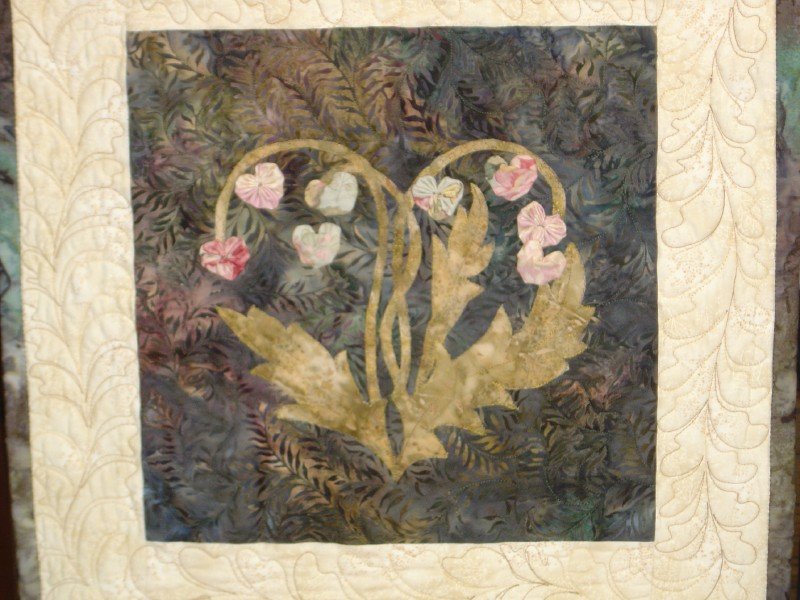 | Design Source - Description | Used Clover's Yo-Yo hearts with machine appliqued leaves and vines inspired from Kathy Delaney's book "Hearts and Flowers". |