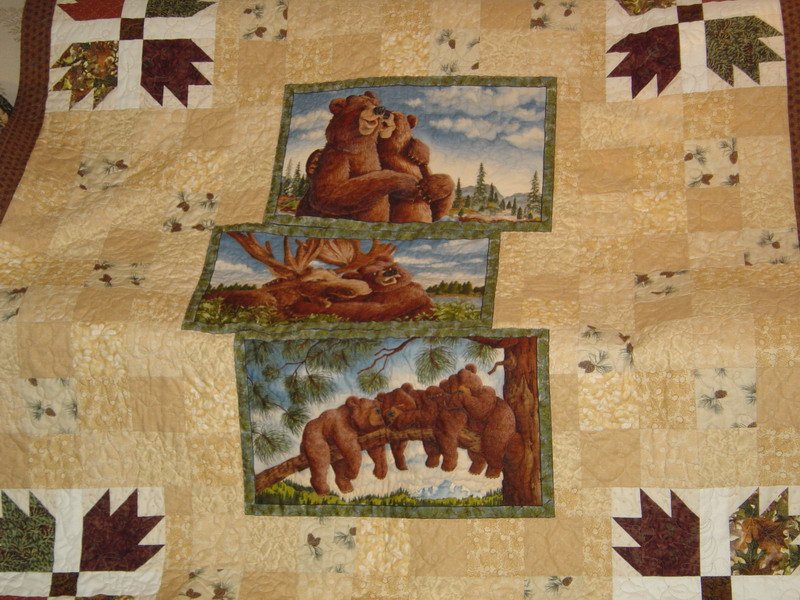 | Design Source - Description | Laughing Bear panel surrounded by small scrappy squares with bear paw blocks in the corners. |
