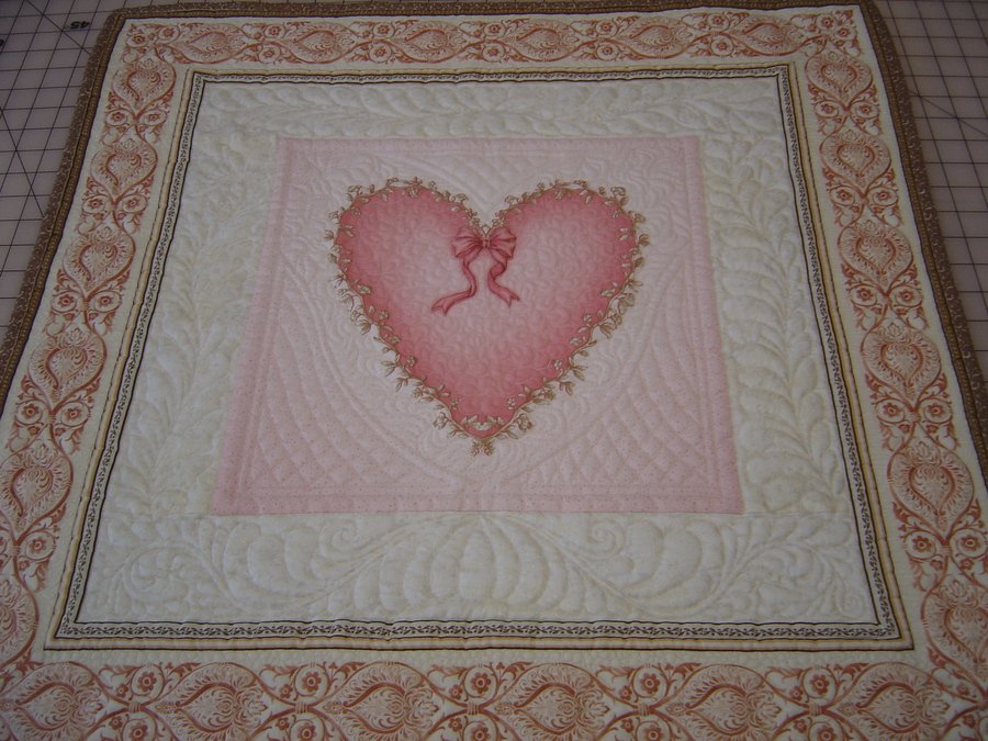 | Design Source - Description | Small heart panel framed in mitered border panel and Fairy Frost, used as a sampler for different kinds of quilting. |