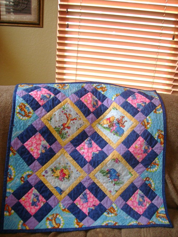| Design Source - Description | I made this quilt for baby Reed Van Eman. it is a nine-patch with fussy-cut squares of Pooh and friends 100% cotton fabrics. This is one of the first baby quilts that I quilted on my new machine. |