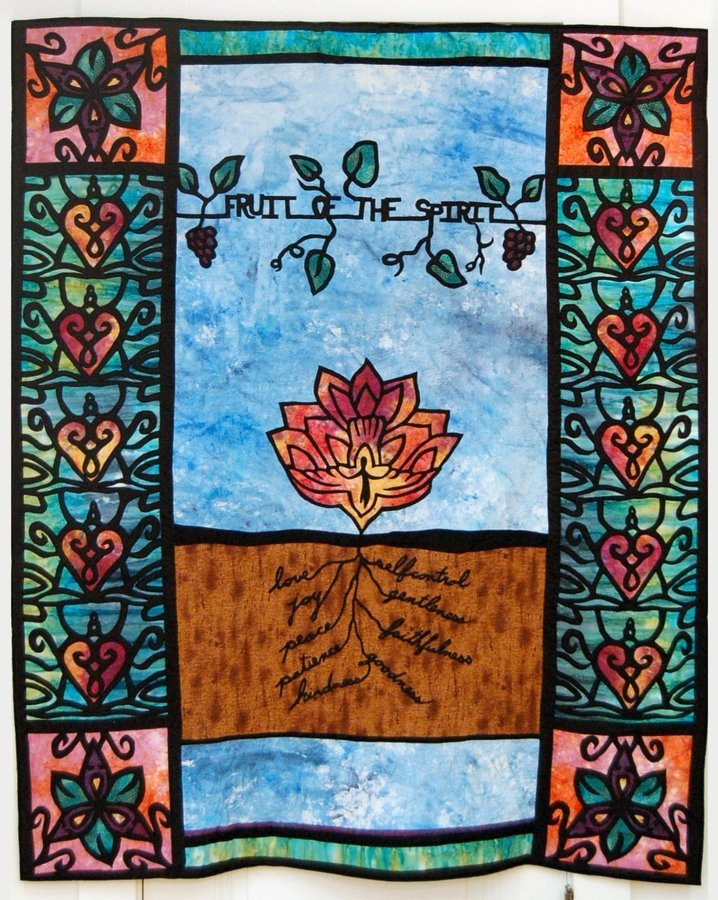 ada123 Fruit of the Spirit - My hand dyed and commercial fabric. Everything is freehand cut and satin stitched to pieced Background uses free-motion quilting.