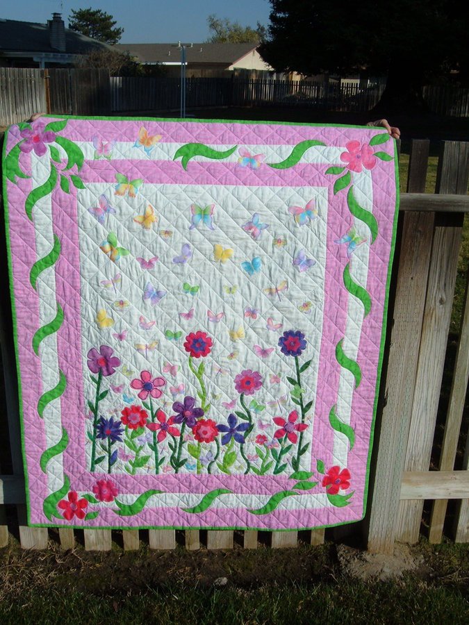 | Design Source - Description | Used Accu-Quilt dies for the border and some of the flowers, then fussy-cut butterflies from various fabrics bought at JoAnn's. |