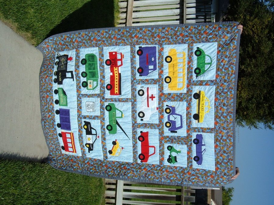 eaberer Transport for Silas - I left out the train signs and tracks and some of the vehicles, then personalized the quilt by putting local Ridgecrest names on the individual police and city vehicles and make one space a parking place for my grandson.