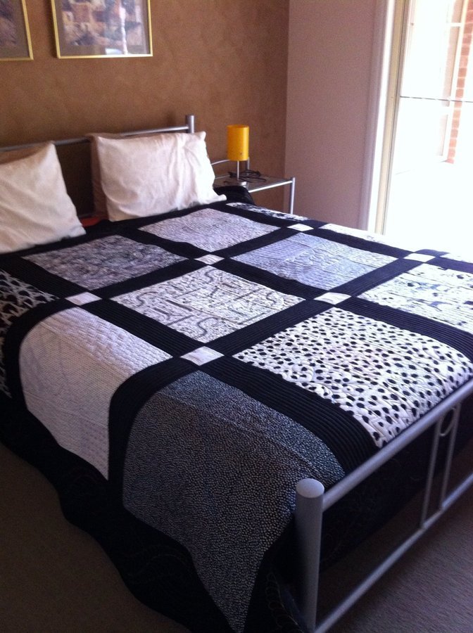 | Design Source - Description | Quilt as you go reversible quilt. Peacock colored blocks with gold sashing and borders, purple cornerstones with gold machine embroidery. Freehand quilted by domestic machine. Black and White back. |