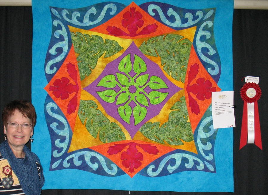 marbles Holo-Holo (Bummin') Kauai - This is a Ricky Tims Rhapsody-style quilt inspired by a trip my daughter and I took to Kauai to celebrate her 37th birthday. I combined my love of Rhapsody-style quilt making with my love of Hawaiian quilting. the center of the quilt was inspired by our trip to the Kauai Hindu Monastery, and the hibiscus flowers all over the island. There is a bump on the the waves in the border, and that, my friends, represents my daughter's bum as she was snorkeling in the ocean.