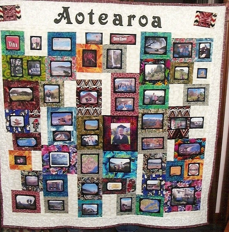 | Design Source - Description | Picture Quilt to commemorate my daughter's teacher training year in N.Z. Made with locally purchased fabrics and quilted with the names of people, places and expressions that are meaningful to her. |
