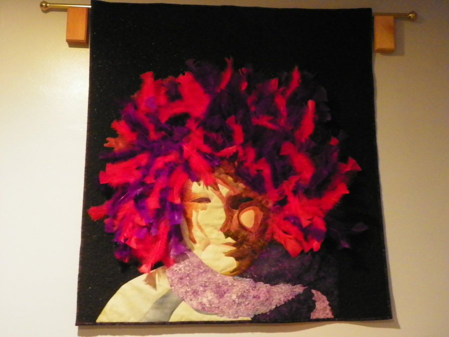 quiltnredhatter Mateo - This is a portrait of my grandson, Mateo, taken at age 5. He was indulging his Nana by wearing one of my Red Hats and standing so I would have lights and darks. I did use lots of red and purple feathers. This was a class with Esterita Austin