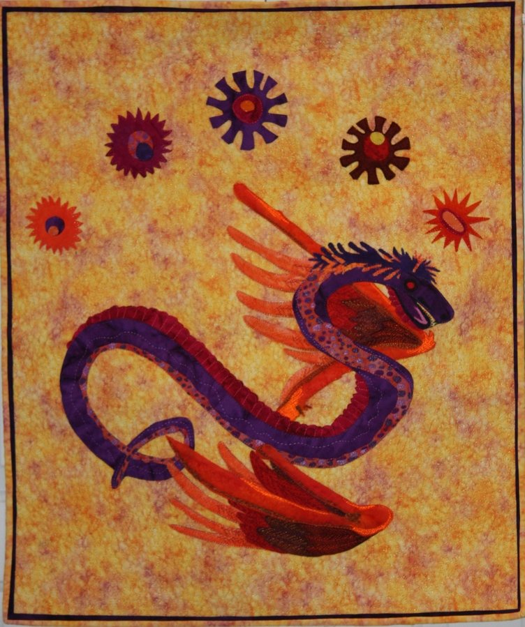 | Design Source - Description | This was made for 2010 Michigan Quilt Artist Invitaional and traveled Michigan for 2 years. The theme was South of the Border. I chose to do a Mexican mythical serpentine god ( a dragon with wings but no arms or legs). |