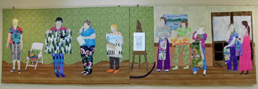 sherrybaby Show and Tell - This is a diptych created by two friends. Sharon Wiley Hightower created the left half and Mary Pavlovich created the right half. The design is based on observation and photos of Show and Tell at our quilt guild, our most popular activity.