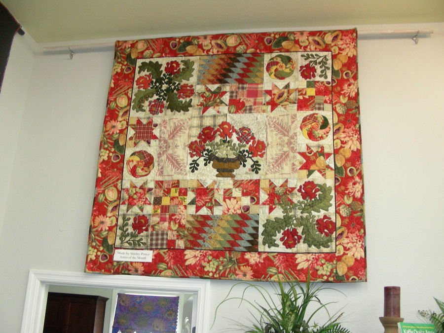 shirleyprince Princess Feathers - I had a beautiful April Cornel Fabric with fruit on it. We were moving so wanted to make a quilt for my new kitchen. I used some orphen blocks I had, some Red Work from my mothers trunk.