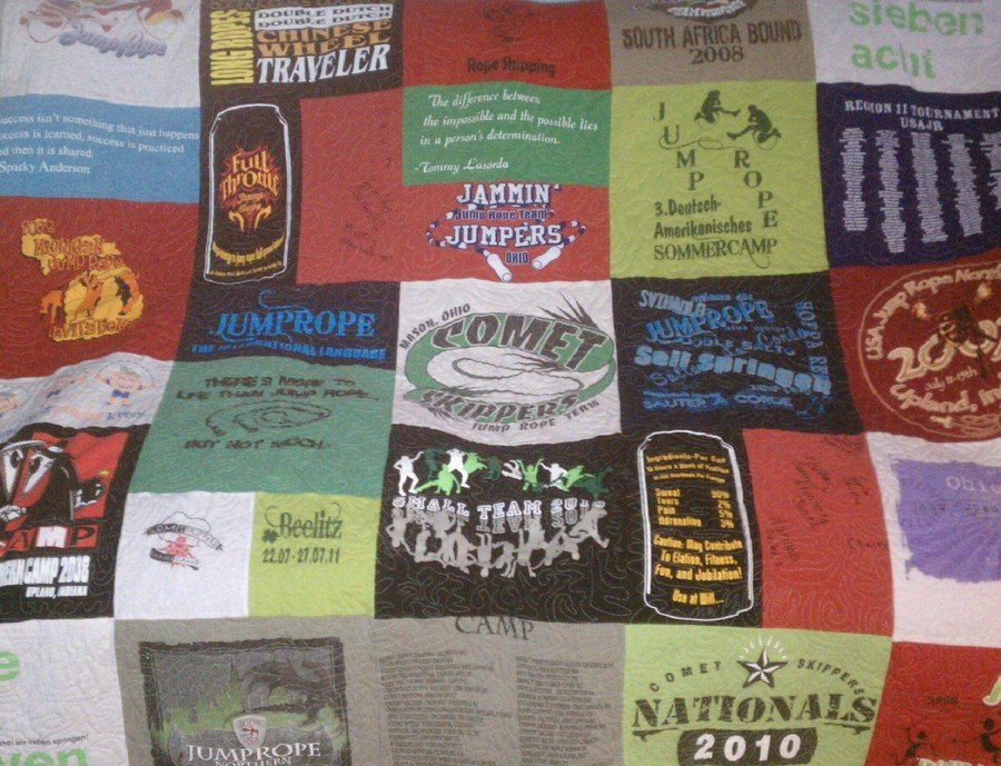 lucyvanpelt jumpin tee's - this was made for jeress as a graduation from high school. He is very big in to competitive jump roping and wanted to preserve his tee shirts he had accumulated over the years. i used to watch him as a child and wanted to do something special for him.